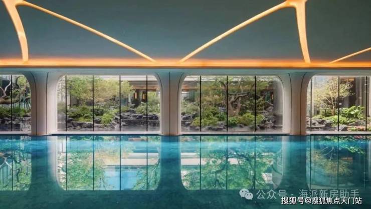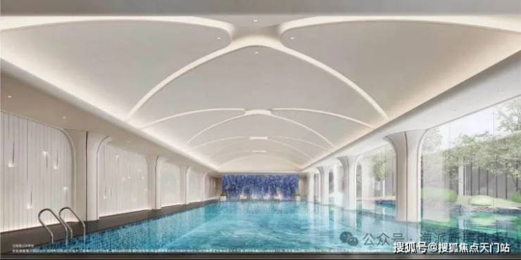 艺术馆般室内无边际泳池••▼,在内部空间设计上,微微拱起的穹顶像云朵漂浮在上空◁,两侧的柱子成花瓣般的典雅造型,向上延伸•△,形成独特的记忆点▪▽。中央庭院一侧的落地幕墙玻璃,实现自然景观的室内延伸感▼▽。泳道尽端的景泰蓝背景墙,更是加强了空间的奢华氛围。